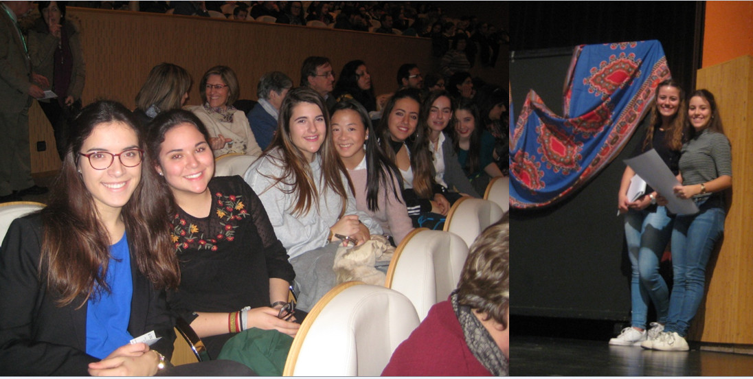 De Izquierda a derecha: el coro preparado para cantar y bailar, Elena Sáez (profesora de Informática y directora del coro) hace la presentación, Mercedes San Martín (Orientadora del bachillerato) y Mª Jesús Ruiz (Profesora de matemáticas del bachillerato) sujetan el cartel del lema del bachillerato.